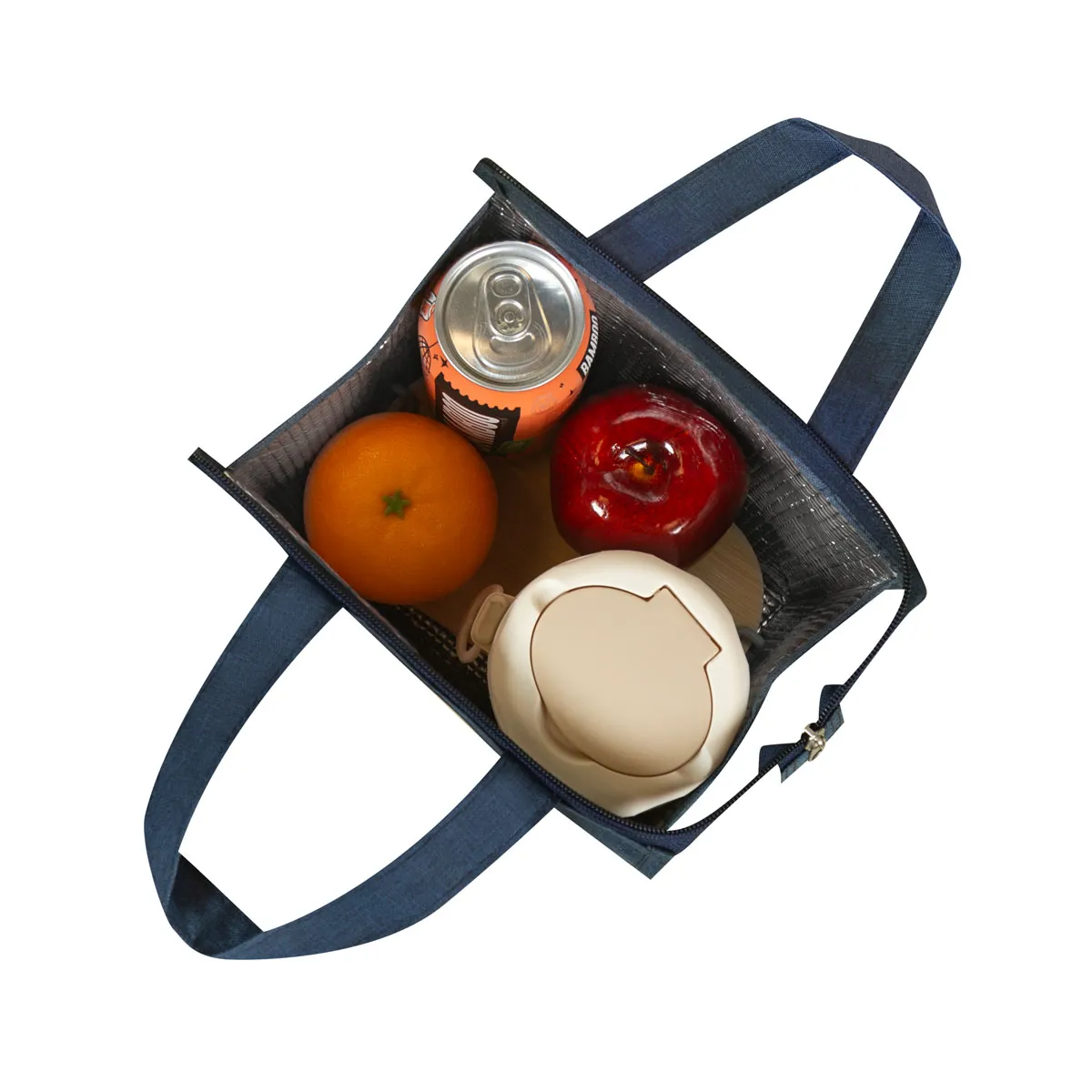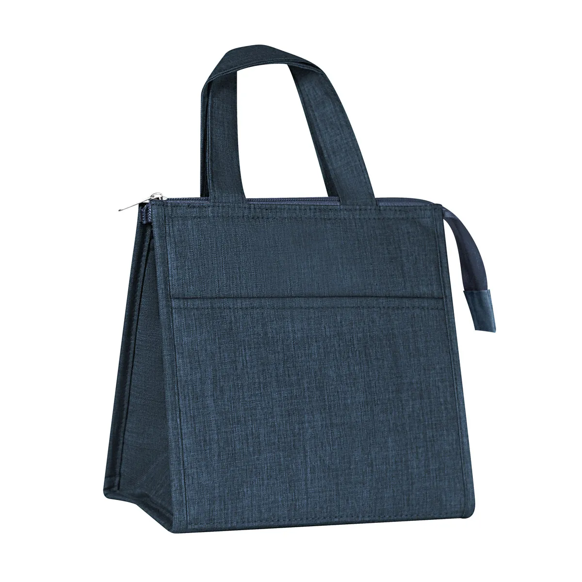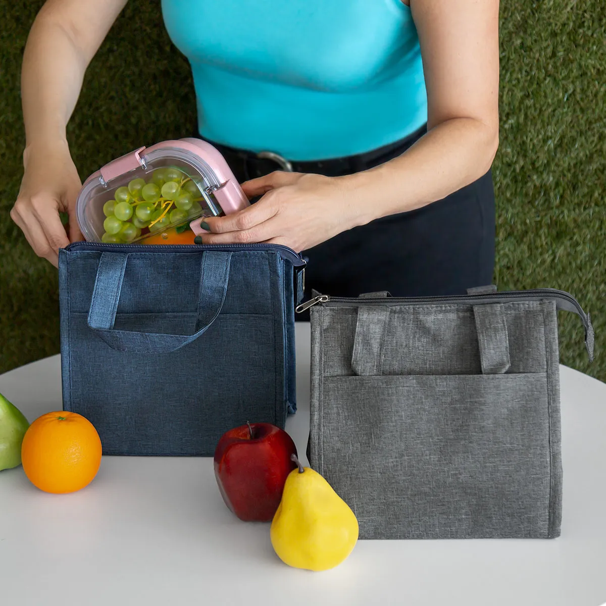 Lonchera de poliester e interior metalizado, bolsillo frontal para organizar utensilios o pequeños accesorios. Bolsa principal con cierre y asa de mano que facilita su portabilidad.