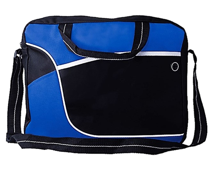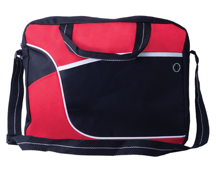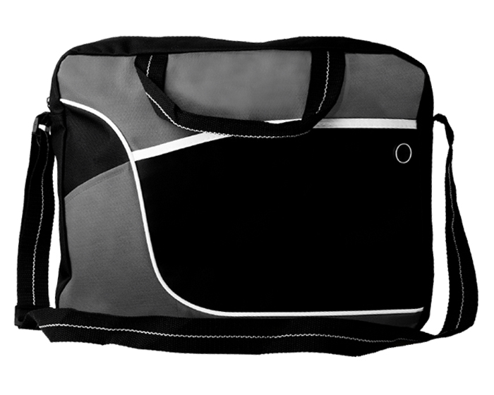 Bolsa tipo portafolio, en poliester, asas y correa ajustable, cuenta con bolsillo externo con broche de velcro y salida para audifonos, en dos tonos de tela combinables.