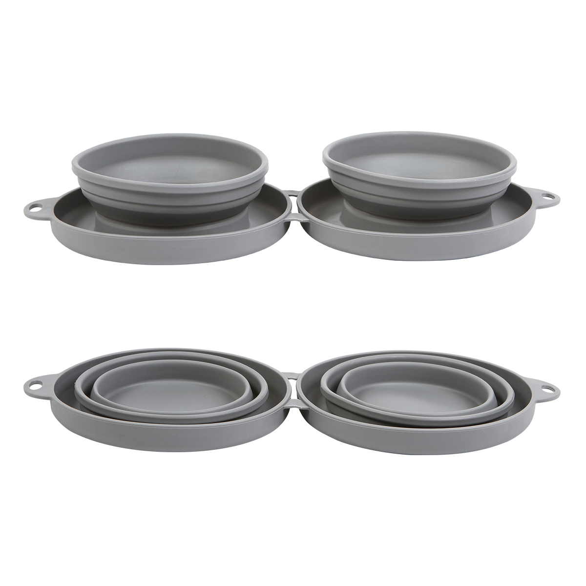 Plato doble compartimento para alimento de mascota fabricado en plástico, con capacidad de 250 ml. Con diseño plegable que facilita su traslado, incluye arnés metálico.