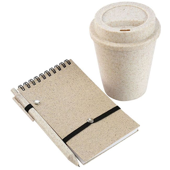 Descripción: Set Trigal Funciones: Incluye Vaso con tapa para café , Block de notas con argollas y Bolígrafo Capacidad vaso: 350 ml Block: 60 hojas rayadas y cierre en elástico