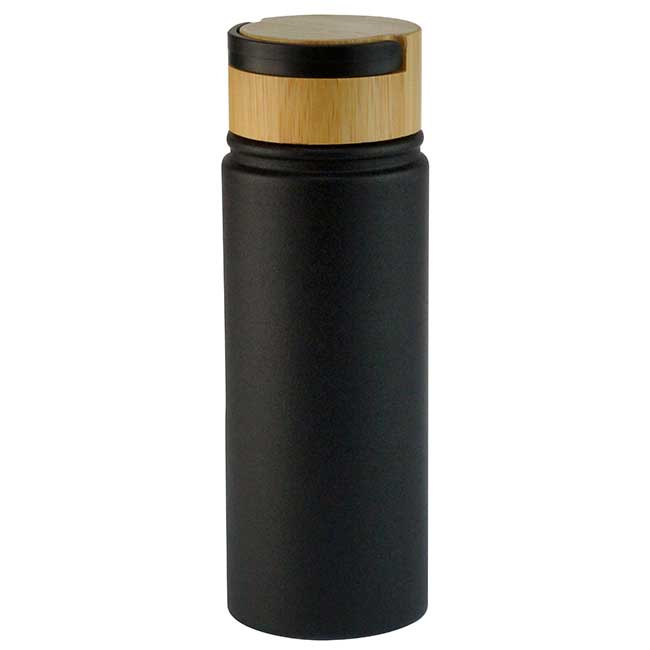 Descripción: Capacidad: 550 ml. Sistema de doble pared al vacío. Tapa de bamboo con cierre en rosca y correa para sujetar. Colores: Blanco y Negro.
