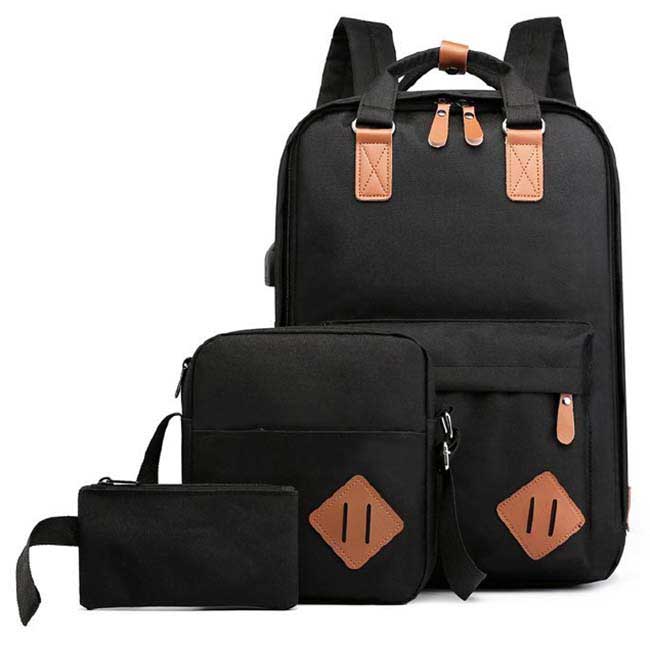 Descripción: Incluye Backpack, bolsa correa larga y bolsillo de mano. Backpack con salida para usb y audífonos. Amplio bolsillo frontal. Compartimiento inferior para laptop. Color: Negro