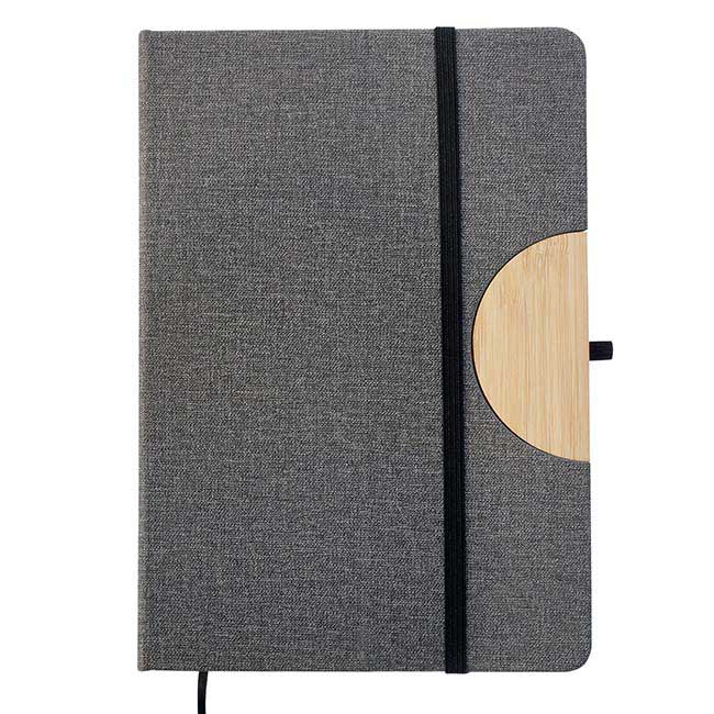 Descripción: Detalle de bamboo en pestaña de cierre. Sistema para stand móvil y porta bolígrafo. Cinta divisoria. Aprox. 80 hojas rayadas. Color: Gris.