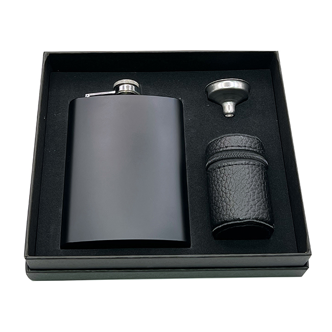 Descripción: Capacidad: 220 ml. Tapa en rosca. Incluye embudo y 4 vasos-shot en estuche de curpiel.