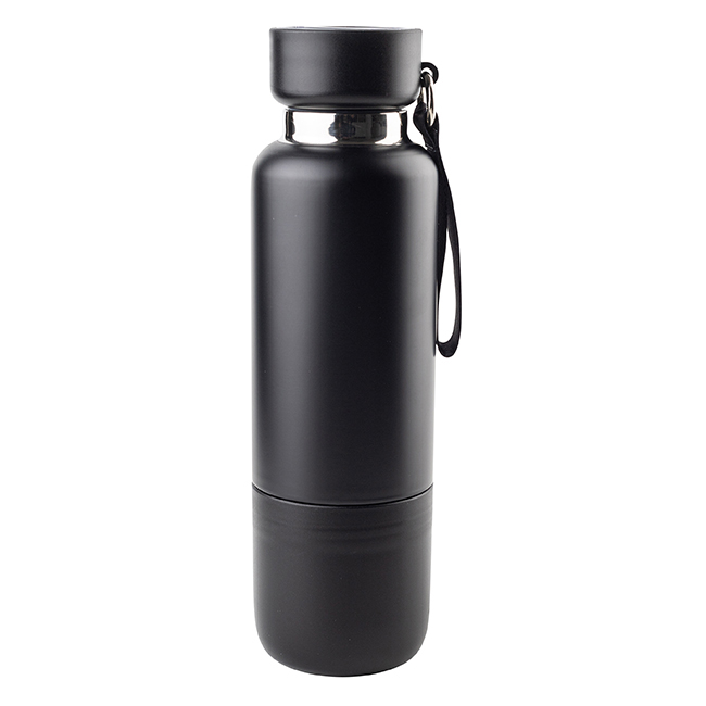 Descripción: Termo Berza Capacidad: 500 ml. Sistema de doble pared al vacío. Tapa en rosca con cierrre hermético y cavidad para almacenaje. Base removible que funciona como taza Doble correa (larga y corta) con argolla arnés para sujetar Colores: Negro y Plata. Material: Acero inoxidable Medida: 25.5 x 6.5 cm diámetro Impresión: Tampografía y Grabado Láser. Área de Impresión: 3.5 x 3.5 cm