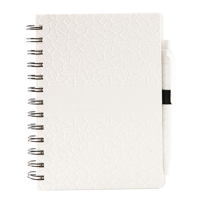 Descripción: Libreta Troya l Libreta con 70 hojas rayadas. l Carátula con detalle de diseño piedra l Incluye bolígrafo de plástico reciclado. l Colores: Blanco y Negro Material: ABS reciclado Medida: 18 x 3 cm. Impresión: Serigrafía Área de Impresión: Libreta: 6 x 1.5 cm Clip Bolígrafo: 3 x 0.5 cm