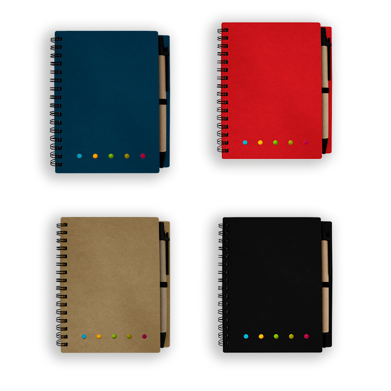 Descripción: Libreta ecológica de cartón con espiral metálico doble, 60 hojas tipo raya y espacios para organización. Incluye: 1 block de notas adhesivas de 7.5 x 7.5 cm 5 indicadores de colores adhesivos de 1.2 x 4.5 cms 1 bolígrafo ecológico tinta negra