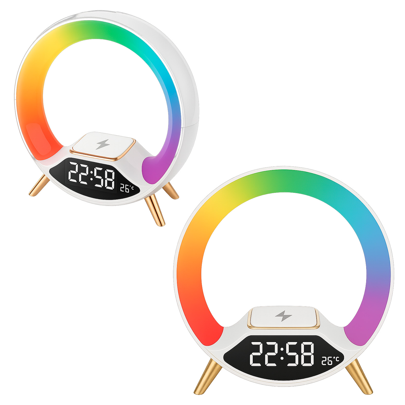 Descripción: Bocina con bluetooth con luz de 7 colores y cargador wireless de 15 W. Compatible con smartphones con tecnología Qi, incluye cable de carga.